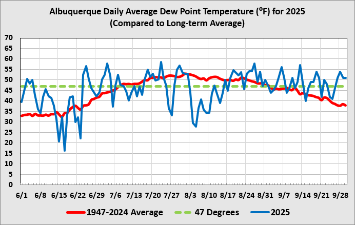 The evolution of the North American Monsoon from Mexico to the United States is noted by the northward progression of convective precipitation from southern Mexico in early June that spreads northward into the southwest U.S. by early July. The onset of the moist phase of the monsoon in New Mexico varies, but average onset occurs around July 3 for the southwest corner of the state and around July 9 for the central Rio Grande valley, including Albuquerque. Although a large-scale circulation change supports the wet phase of the monsoon with an increase in atmospheric moisture, once onset occurs there is considerable variability in the day-to-day precipitation. Active periods of precipitation are known as monsoon "bursts", and are separated by drier, less active monsoon "breaks". Dewpoint temperature is one of many parameters used to monitor moisture surges of the North American Monsoon across the southwest U.S. The charts below show how much variability can occur from year-to-year at the Albuquerque Sunport.