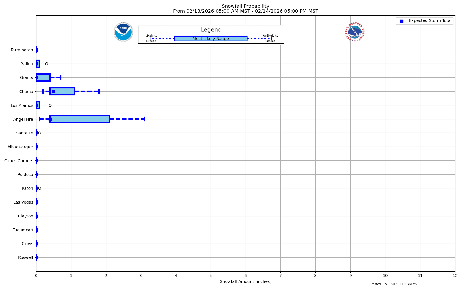 The "Range" map is the 25th percentile (lower number) to 75th percentile (higher number) of possible snowfall amounts based on the Weather Prediction Center (WPC) Super Ensemble output during the time period of the graphic. The official NWS snowfall forecast influences this range of values either up or down depending upon how closely they match. |