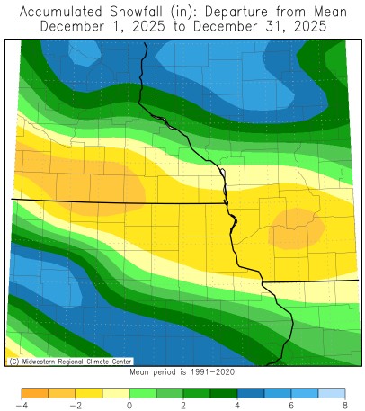 - Snowfall anomalies ranged from 3" below normal to 7" above normal.