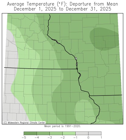 - During December 2025, average temperatures ranged from 14.9°F at Medford Taylor County Airport, WI (AWOS) to 22.5°F at Guttenberg Lock & Dam 10 (COOP).