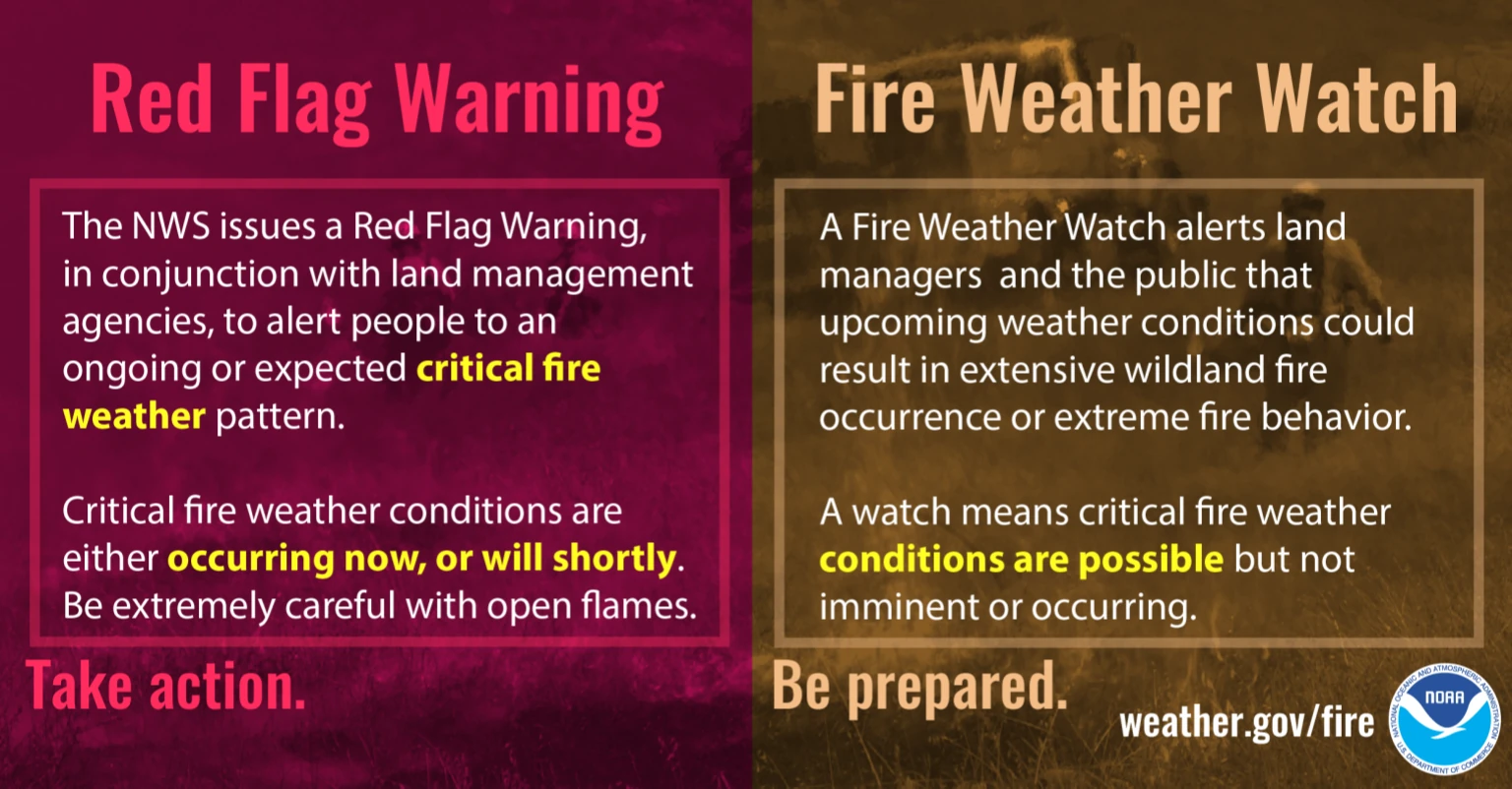 Critical fire weather conditions occur when there is a combination of weather conditions and dry vegetation creating the potential for rapid wildfire spread and extreme fire behavior. The weather conditions that are conducive for dangerous wildfires are warm temperatures, low humidity, and strong, gusty winds. When critical fire weather conditions are expected along with dry vegetation, the National Weather Service will issue a Fire Weather Watch or Red Flag Warning.