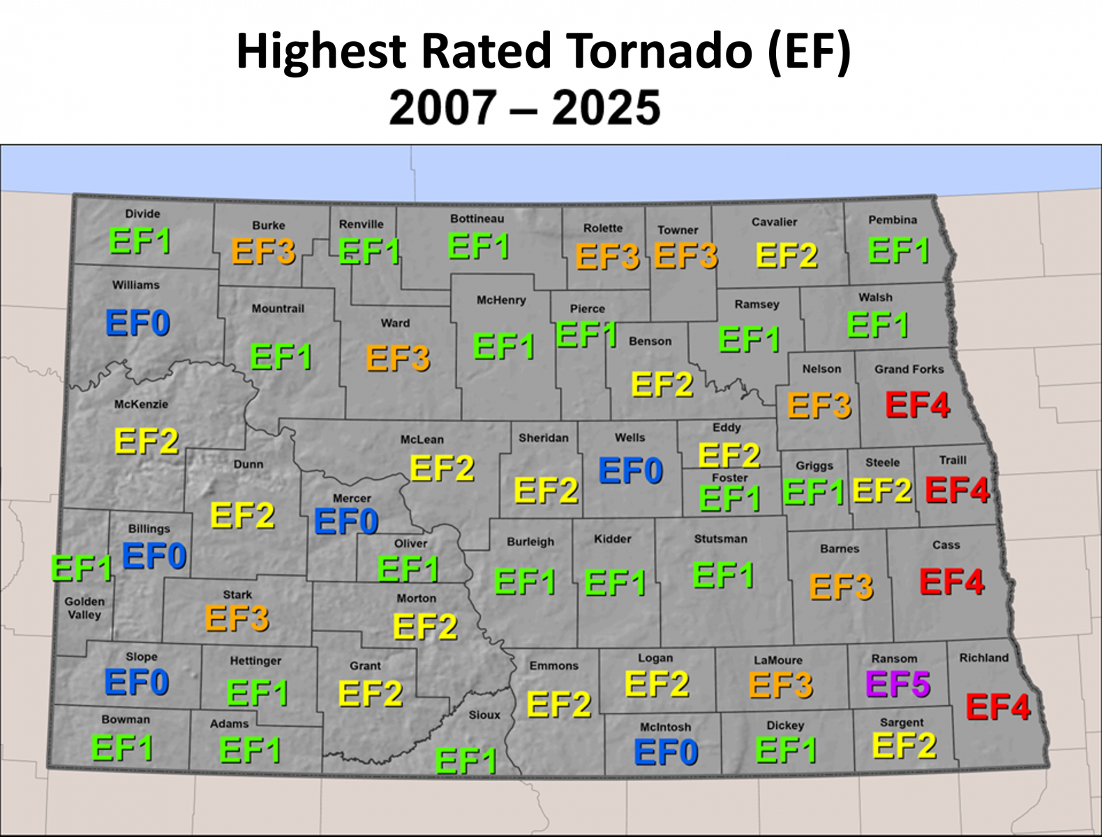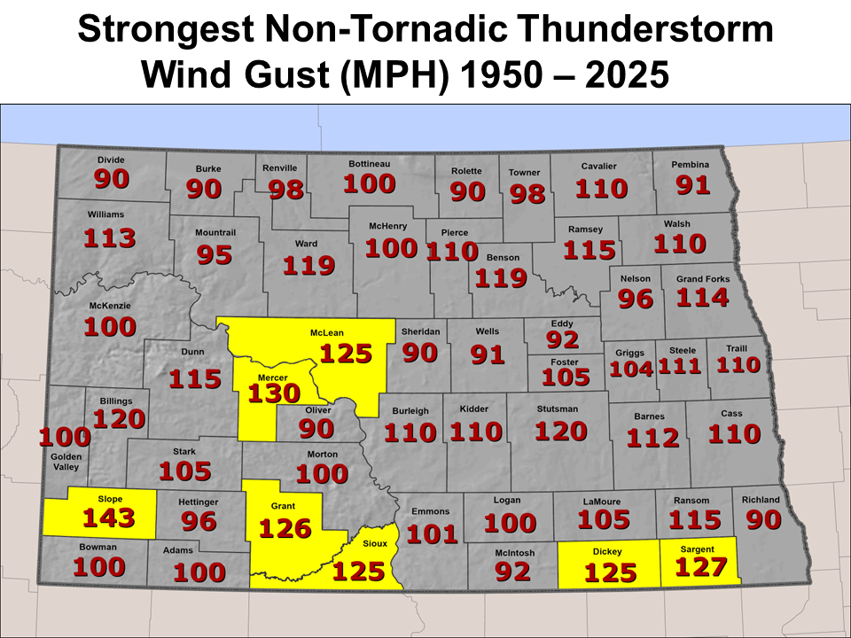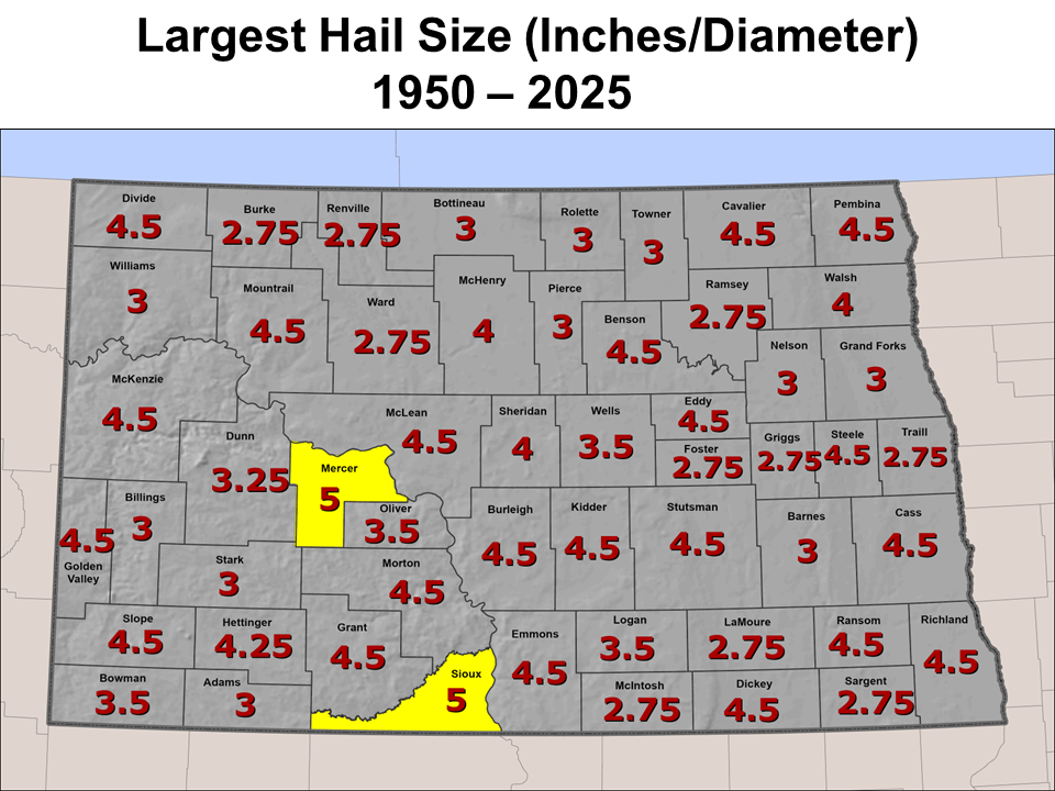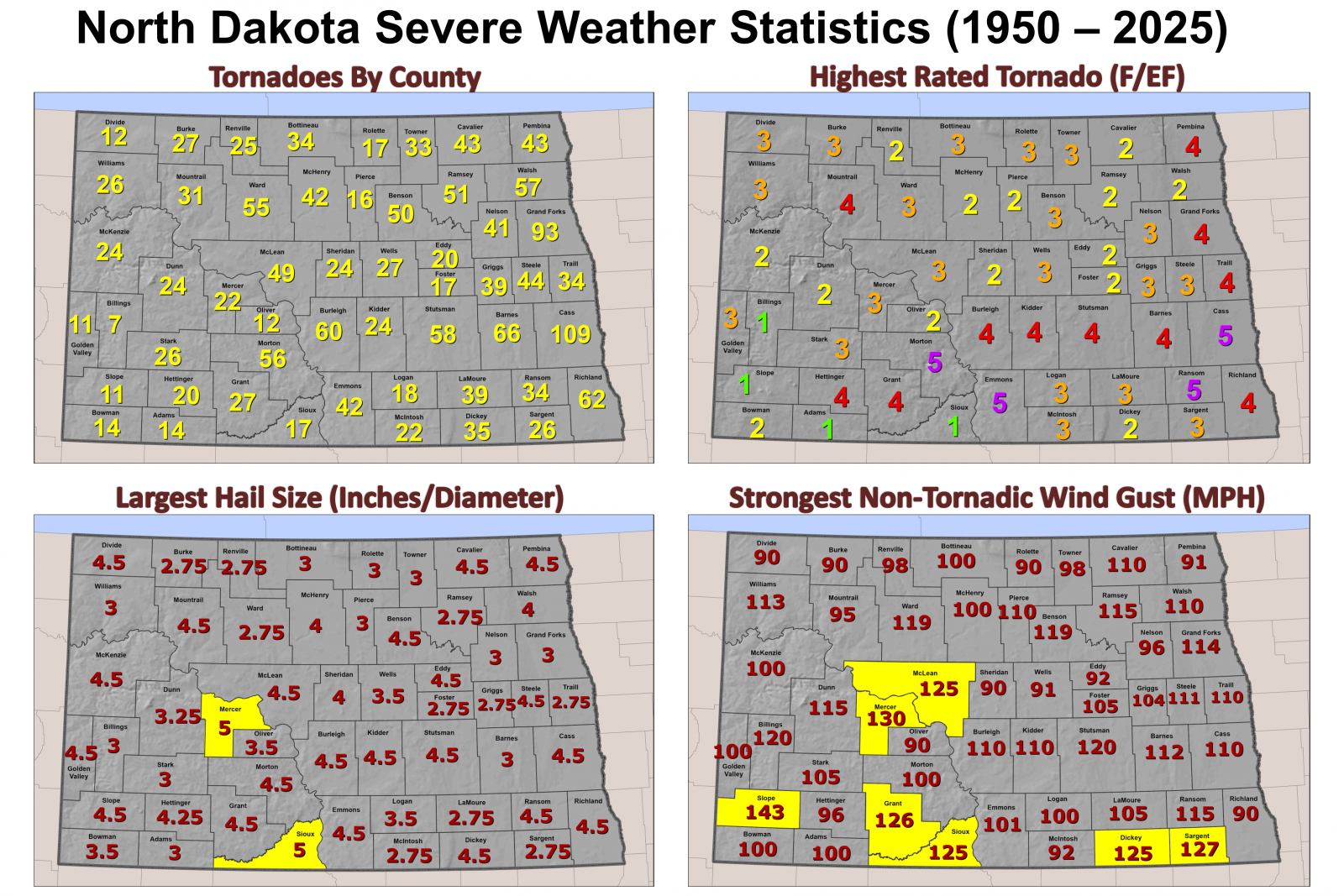 North Dakota Tornado, Greatest Hail size and Highest Wind Gust per county.