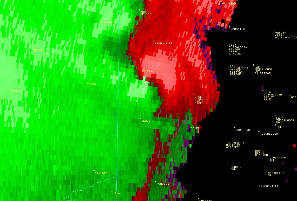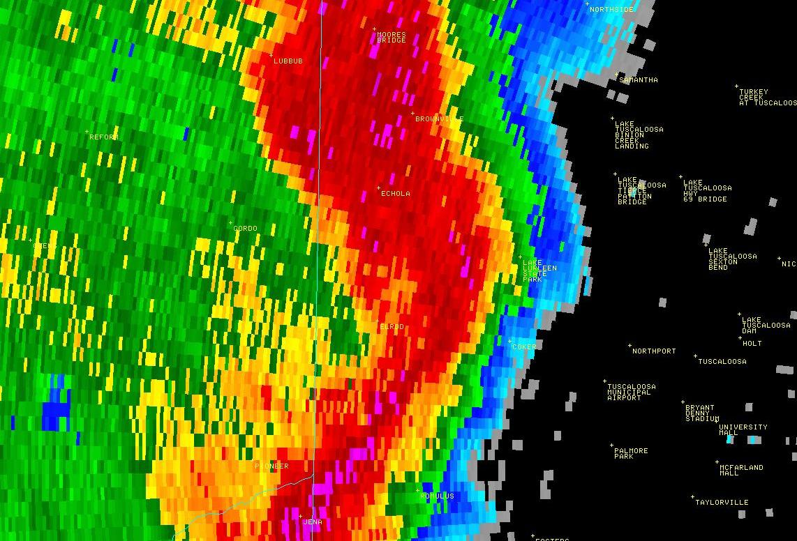 tornado. Winds were estimated to be around 140 mph. This tornado developed along a Quasi-Linear Convective System in far eastern Pickens County, 5.5 miles south southeast of Gordo and moved northeastward for 3.46 miles. It crossed into Tuscaloosa County just to the west of Holman, south of AL Hwy 140. This tornado continued for almost 19 miles in Tuscaloosa County before it dissipated 2.5 miles east northeast of Samantha. The tornado touched down east of AL Hwy 63, along Grover Plate Rd where it uprooted many hardwood trees. The tornado continued to cause tree damage as it moved northeast and approached the Tuscaloosa County Line. The tornado damage in Pickens County was consistent with an EF1 rating and winds of 90 mph.