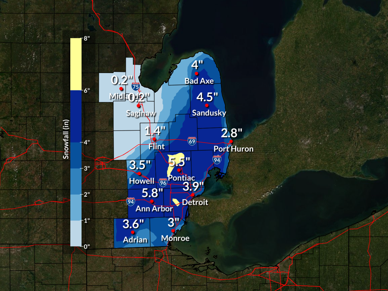 Estimated snowfall totals across Southeast Michigan from January 14-15, 2026. |