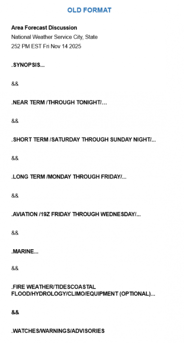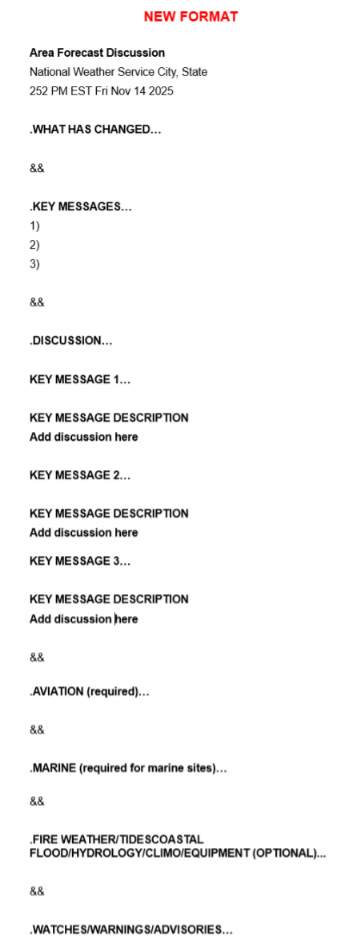 Format Change Details: The following images show the difference in the format layout compared to the old and new Area Forecast Discussion. Note that the biggest shift is format is from a "time" based chronological layout to a Key Message Hazard priority. In addition, some legacy format options still remain, such as a list of the current hazards at the bottom.
