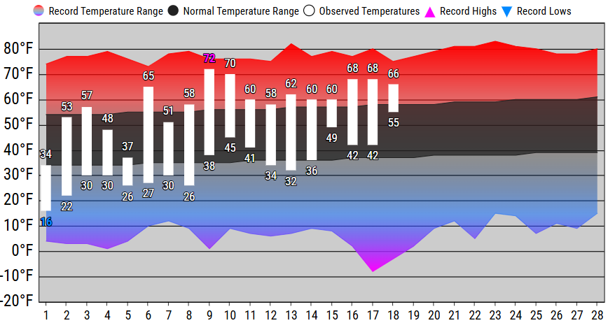 This graphic contains daily climate data (climate normals and records) for today for the sites listed. The legend is in the upper left portion of the image. The current normals period is 1991-2020.