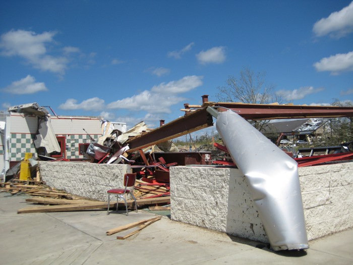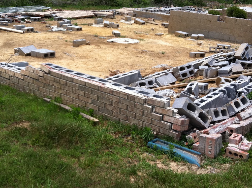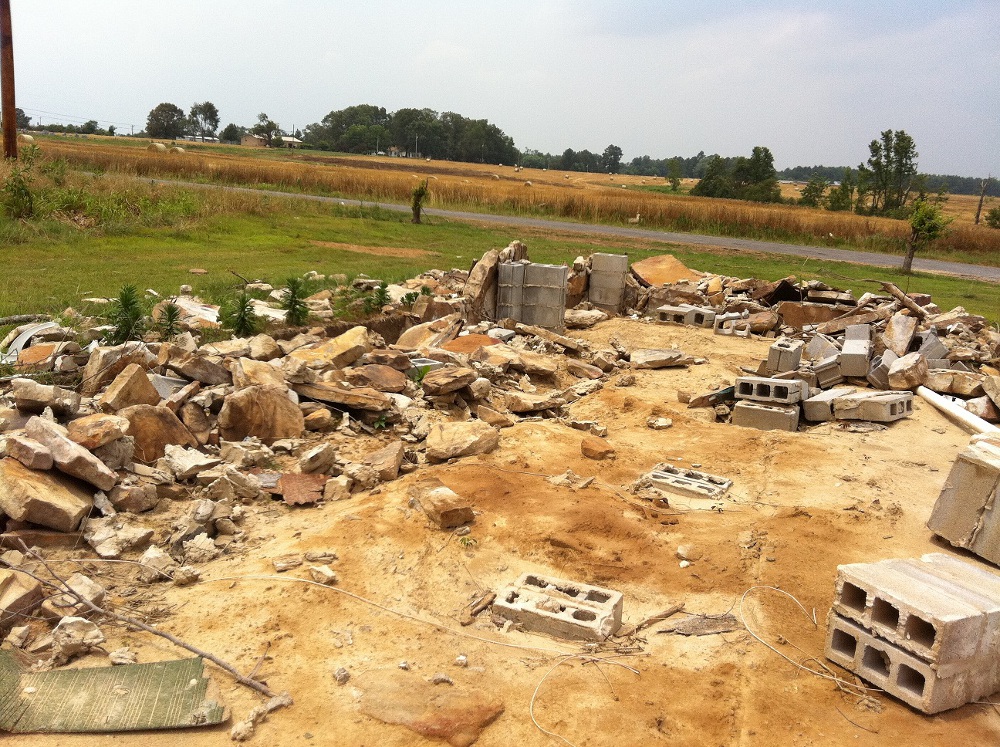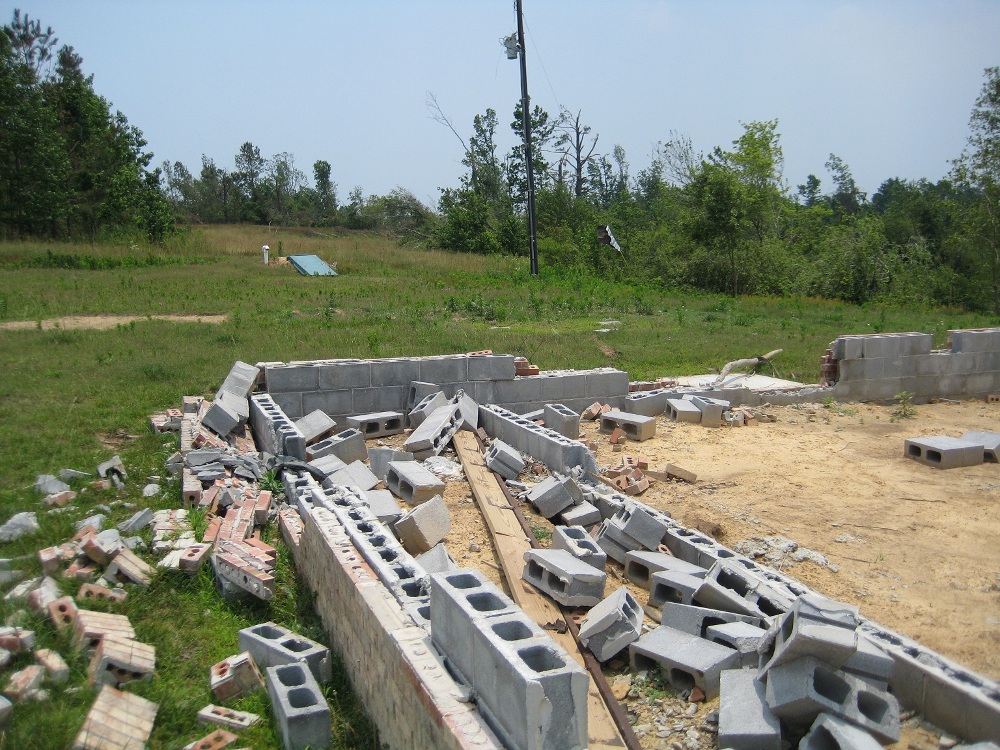 On the second day of surveys, information was received from DeKalb County EMA, who conducted several areal surveys and determined that the tornado damage path was indeed continuous from the Lakeview community through Rainsville, Sylvania, and then to south of the Cartersville area in northeastern DeKalb County. Further damage was observed to the north of Cartersville and into Northwest Georgia, but this was later determined to be another tornado track from earlier in the day. Ground surveys were conducted from the Blake community into southeast Sylvania, then through Henagar, Ider, and to the Cartersville area. The tornado damage continued along the path from the Blake community, intersecting County Road 27 and continuing to the northeast, running parellel between Hwy 75 and Interstate 59 through Henagar, Ider and then to south of Cartersville. In the Blake community, the tornado damage width was estimated to be one half to as much as three-quarters of a mile wide. Along County Road 27 just southeast of the Sylvania community, significant damage was observed. All exterior and interior walls of several homes were completely destroyed with partial block and mortar foundations remaining. In one instance, a concrete slab that served as a porch was displaced a few feet and broken in half. Some hardwood trees in the area were stripped with no stubs of any branches remaining and were partially debarked. The Mountain View Baptist Church, which was just inside the Sylvania community also sustained significant damage. An old, one-story portion of the church dating to 1902 and constructed of a brick and mortar exterior on wood frame walls was completely destroyed. A recent two-story addition to the church constructed in 2004 and consisting of similar building materials was partially destroyed, with most exterior walls and nearly all interior walls fallen. A concrete block and mortar foundation was all that remained of a hallway adjoining the two buildings.