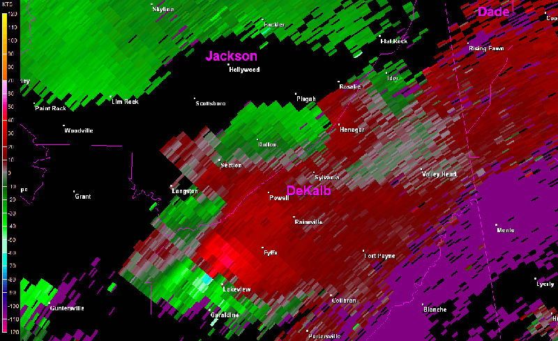 The tornado path is likely to have begun in the Lakeview community northeast of Geraldine before tracking northeastward, generally parallel to and just east of State Route 75. Along this line, the tornado passed through Fyffe, Rainsville, Sylvania, and eventually into northern DeKalb County south of the Cartersville community. On the first day of surveys, the survey team noticed intial damage in the Lakeview community where the path width was generally around 50 yards. This initial damage included mostly felled and snapped trees and structural damage to small buildings. Extensive damage was noted especially in the Rainsvile and Sylvania communities where the path width was estimated to be up to 1/2 mile wide. Damage in Rainsville included houses that were completely removed from foundations, with debris scattered for about one mile. Near this location, trees were debarked and a few mobile homes were completely destroyed, with debris strewn for about a mile downstream. In the Sylvania community, a similar situation occurred with houses completely removed from foundations and debris blown far downstream. Some of these houses were connected to their foundations with anchor bolts and foundation straps, indicating a stronger construction of the homes.
