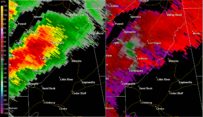 Birmingham, AL Radar (BMX) radar loop of the EF-2 tornado track.  The imagery on the left is reflectivity, while the imagery on the right is storm-relative velocity.  Click on the image to loop.