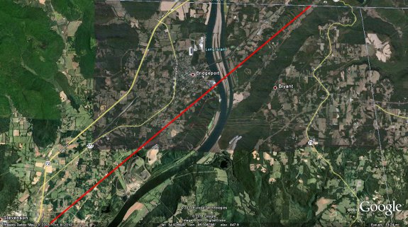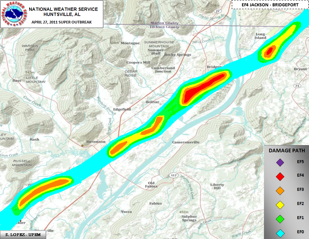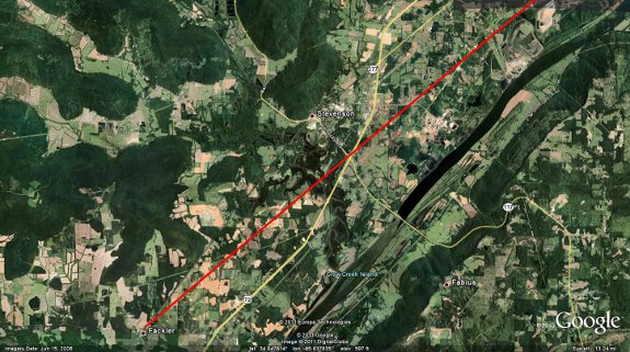 The tornado initially touched down northeast of the Fackler community along County Road (CR) 42 where several large trees were snapped and there was minor damage to mobile homes. The tornado then continued east-northeast, producing tree damage as it crossed Highway 72 near the intersection of Alabama Highway 117. On Oak Hill Road just east of Hwy 72, large trees were snapped and roof damage was observed on several residences. On CR 286, a trailer was tipped over and a shed was partially destroyed. The tornado continued northeast producing heavy tree damage. EF-3 damage was observed along CR 96 just northeast of the Stevenson Airport where 24 high tension electrical truss towers were twisted and flattened. Just south of the intersection of CR 96 and Alabama Hwy 277, a mobile home was obliterated and another home collapsed. Two other homes sustained structural damage along this section of road, two mobile homes were rolled on their side, and a metal barn was destroyed. | ||||||||||||||||
