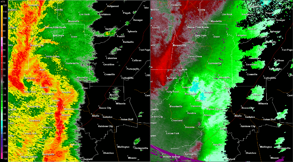 Hytop, AL Radar (HTX) radar loop of the EF-1 tornado track.  The imagery on the left is reflectivity, while the imagery on the right is storm-relative velocity.  Click on the image to loop.