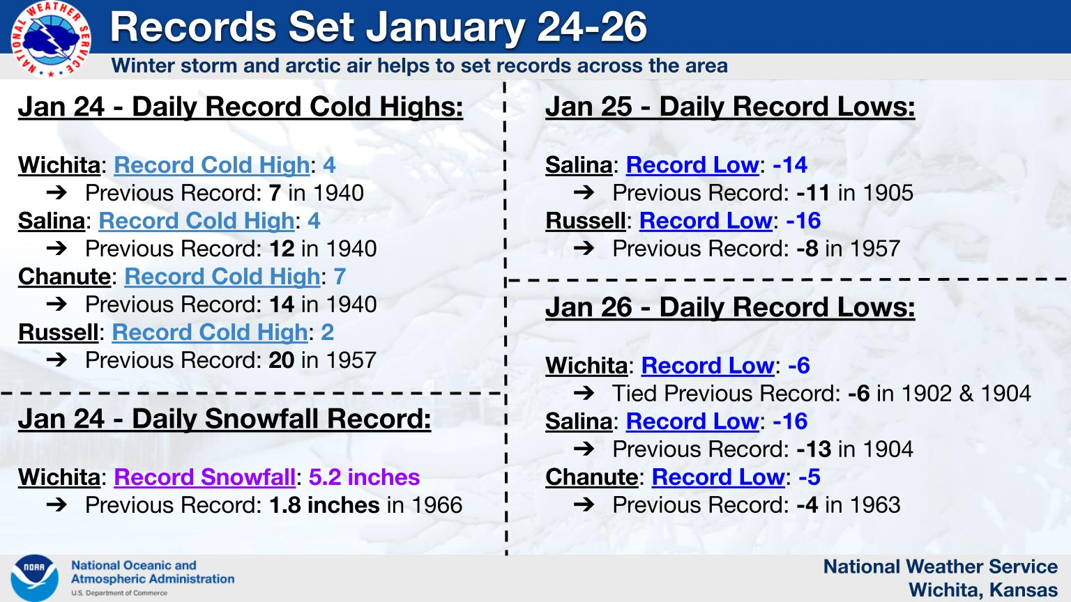 A prolonged winter storm affected the Southern Plains on January 23rd through the 25th. This was a far reaching storm that brought hazardous winter weather from the Texas Panhandle through the Mississippi, Ohio and Tennessee Valleys and finally across the Eastern Seaboard. While this storm produced crippling ice accumulation to many of these areas, central and eastern Kansas saw all snow. In fact, it snowed for 40 straight hours in Wichita with most locations picking up between 4 and 8 inches. Even more impressive than the snow, was the extreme cold air that spilled south across the Plains. Nine temperature records were either set or tied during the January 23rd through January 26th time frame. Both Russell and Salina saw low temperatures of -16 during this time frame with widespread wind chills in the 10 to 20 below zero range. |