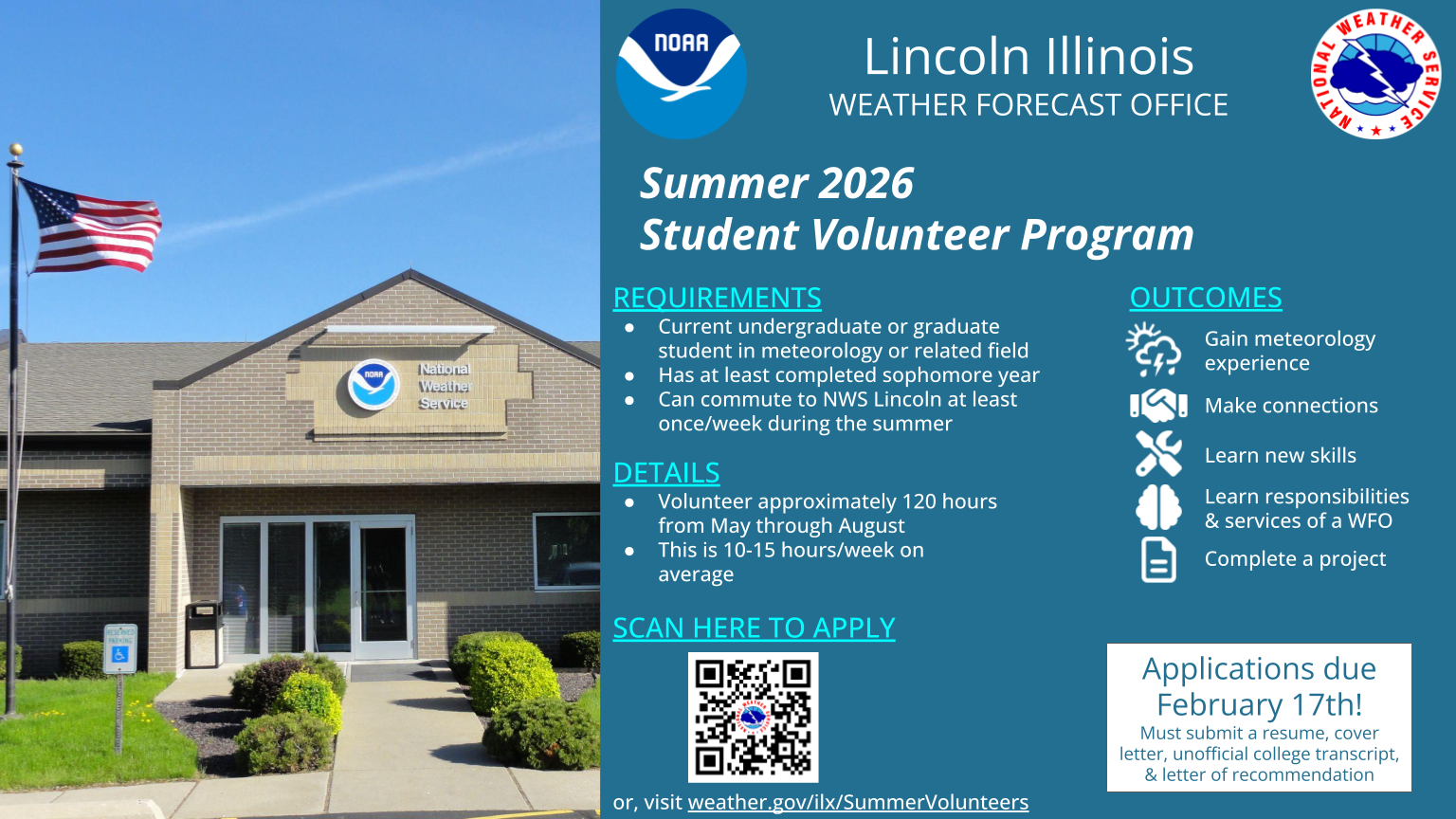 Description: Are you a student looking for insight into what a career in the National Weather Service (NWS) may involve? If so, this may be a great opportunity for you! The NWS office in Lincoln, IL is accepting applications for a student volunteer position for the summer of 2026. During this volunteer experience, you will learn many aspects of day-to-day operations, developing an understanding of the culture, responsibilities, and services of a weather forecast office. In addition, you will have the opportunity to participate in a small research project and office outreach. This will give you the opportunity to determine whether you'd like to pursue a career with the National Weather Service.