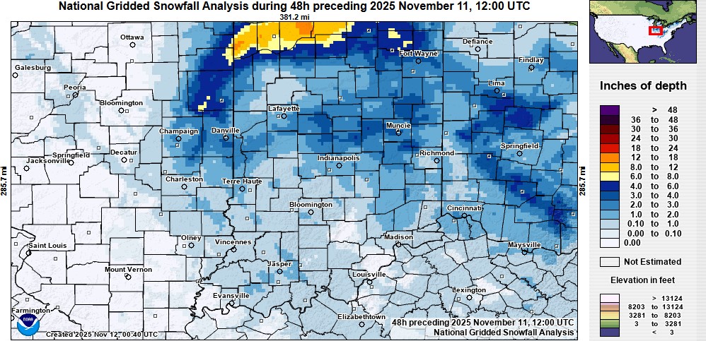 A system along with influence from Lake Michigan brought snow up to a few inches in central Indiana, with much higher totals closer to Lake Michigan. 1.3 inches of snow fell at Indianapolis on November 10, setting a daily record. The city had not recorded so much snow that early in the season since 2.4 inches fell on October 30, 1993. (The total snowfall at Indy was 1.8 inches for November 9-10). |
