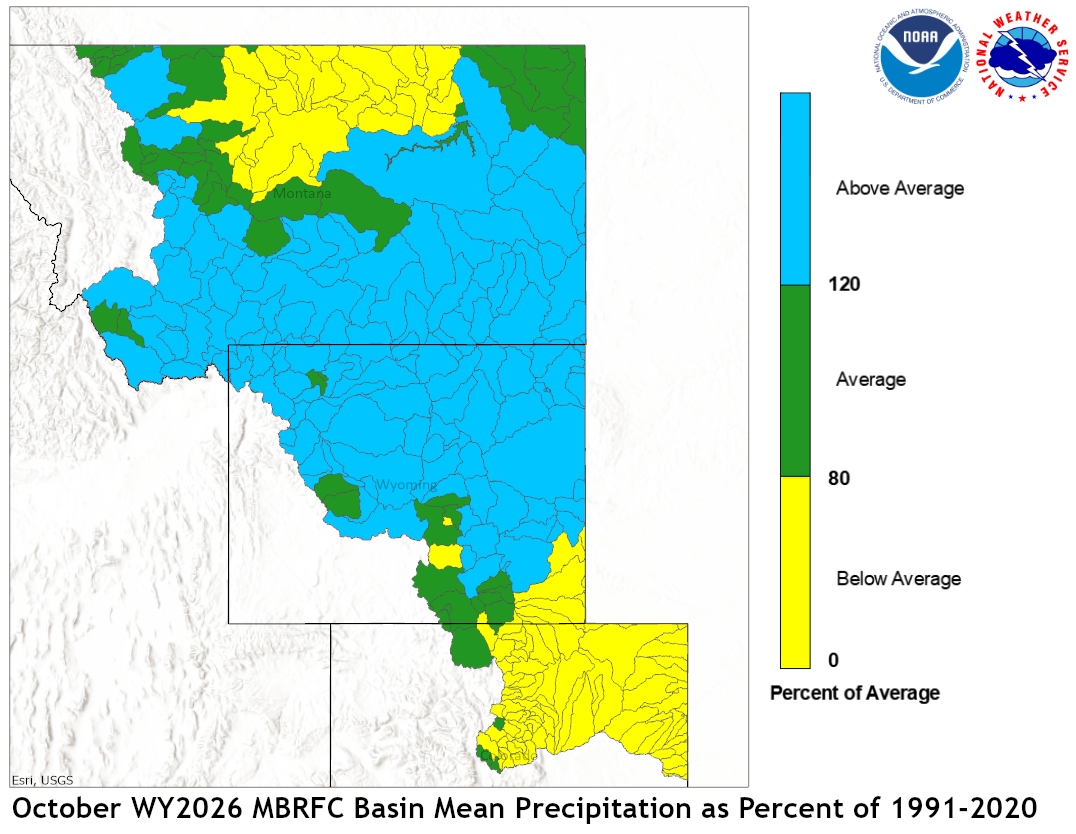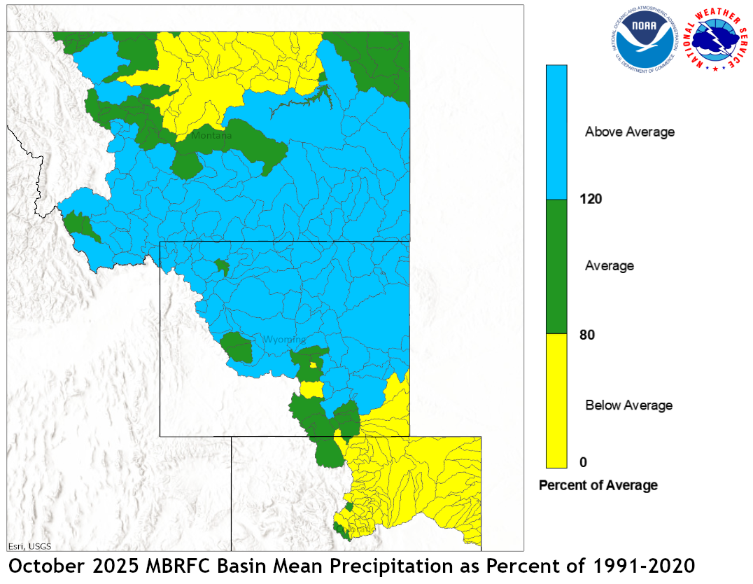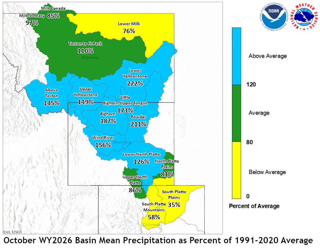 Precipitation during October was above average. The upper Yellowstone River Basin received 149 percent of average precipitation while the Lower Yellowstone River Basin reported 222 percent of average. The Bighorn Basin received 187 percent of average precipitation while the Wind River Basin received 156 percent of average. The Little Bighorn - Upper Tongue Basin received 171 percent of average and the Powder River had 211 percent of average precipitation.