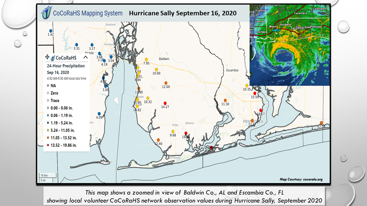 National Weather Service Mobile/Pensacola uses CoCoRaHS data to document high-impact rainfall events over the central Gulf Coast. We do this by creating webpages highlighting the event using GIS as another visualization tool in describing the areal footprint of rainfall in greater detail. Please see the following web pages on the two events shown earlier on this page: Hurricane Sally and June 2023 Heavy Rain.