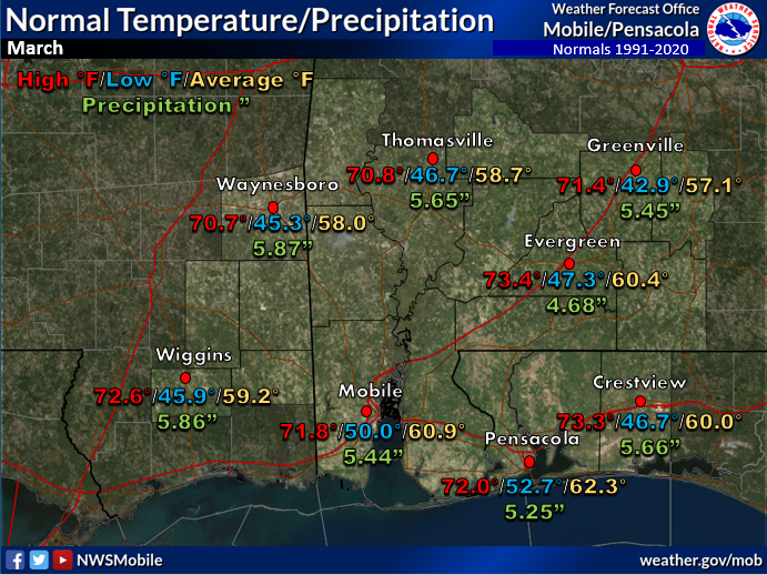February 2026 in Review - As is typical of the cold season, February saw extremes about the climatological means in both temperature metrics, that being daily highs and lows. From an average perspective, temperatures for the month were above normal at Mobile and Pensacola. In fact, Mobile's average monthly high of 70.0° stands in the top ten warmest February's on record tying at number eight with the last occurrence a year ago. To start off the month, it was on the cold side of climatology mostly in low temperatures for the first week from the 1st to the 8th, when daytime minima averaged 11.8° below normal at Mobile and 10.6° below normal at Pensacola. Temperatures moderated and becoming steady state above normal from the 9th to the 21st where highs and lows through the period averaged 10.2° above normal and 9.2° above normal respectively at Mobile. During this stretch three record highs and two record high low temperatures were matched or broken at Mobile. The high on the 20th of 85° tied for the warmest daily temperature in February with the other occurrence, not long ago on February 8th, 2023. For the same period, Pensacola's highs and lows warmed, averaging 7.8° above normal and 9.4° above normal respectively. During the same stretch three record highs and one record high low temperature were matched or broken at Pensacola. The morning temperature at Pensacola on the 20th of 71° tied for the warmest daily low temperature in February with the two other occurrences on the 23rd and 28th of 2023. A notable, but brief cold spell following the passage of a strong cold front the evening of the 21st sent highs and lows diving. The coldest mornings the latter half of the month were the 23rd and 24th where lows these two mornings averaged 16.0° below normal at Mobile and 17.0° below normal. Temperatures rebounded to close out the month.