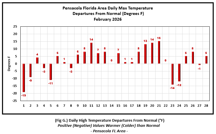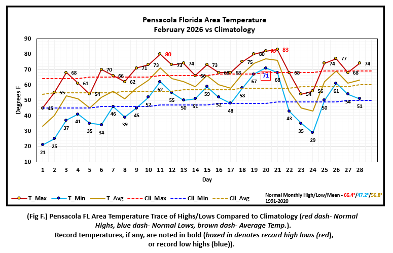 Pensacola Florida Area [Climate Normal Period 1991-2020, Climate Record Period 1879 to Present] - The average monthly high of 68.5° was 2.1° above normal. The average monthly low was 47.8° or 0.6° above normal. The average monthly temperature of 58.2° was 1.4° above normal. The highest temperature for the month, 83°, occurred on the 21st and was 15° above normal for the date. The lowest temperature for the month sank to 21° on day one, 24° below normal for the date. Pensacola saw four record temperatures for the month of February. (Fig. F) shows a graphical representation of how the Pensacola area temperatures compared to the seasonal normal daily highs and lows, which are shown by the colored dashed lines. (Figs. G and H) shows the daily high/low temperature departures from normal. The rain gauge collected over three inches at 3.26" (Fig. I), 1.51" below the monthly normal. Accumulated rainfall to date indicates a deficit over three inches compared to normal (Fig. J).
