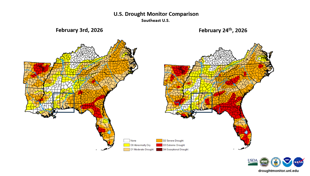 Rainfall continues to be in short supply with February's monthly rainfall in deficit by nearly three inches at Mobile. In fact, February 2026 is seventh driest on record at Mobile. Rainfall in Pensacola was just short of two inches of normal. Drought has worsened over the central Gulf coast.