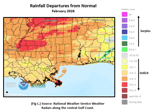 Mobile Alabama Area [Climate Normal Period 1991-2020, Climate Record Period 1872 to Present]- The average monthly high of 70.0° was 4.4° above normal and tying for 8th warmest monthly average February high on record with last occurrence a year ago. The average monthly low was 45.1° or 0.7° above normal. The average monthly temperature of 57.5° was 2.5° above normal. The highest temperature for the month, 85°, occurred on the 20th and 18° above normal for the date. This has also tied for warmest daily February temperature since 1872, matching the other occurrence on the 28th in 2023. The lowest temperature for the month plummeted to 18° on day one, 24° below normal for the date. Mobile saw five record temperatures for the month of February. (Fig. A) shows a graphical representation of how the Mobile area temperatures compared to the seasonal normal daily highs and lows, which are shown by the colored dashed lines. Bar graphs reflecting the daily high/low temperature departures from normal are provided in the table below (Figs. B and C). The rain gauge collected a seventh driest 1.49" (Fig. D), or 2.98" below normal. Accumulated rainfall to date, 3.04" indicates a deficit now by over seven inches against what we would normally expect this time of year (Fig. E). This is nearly a third of an inch above the driest two-month period on record which was 2.72" from 1954.