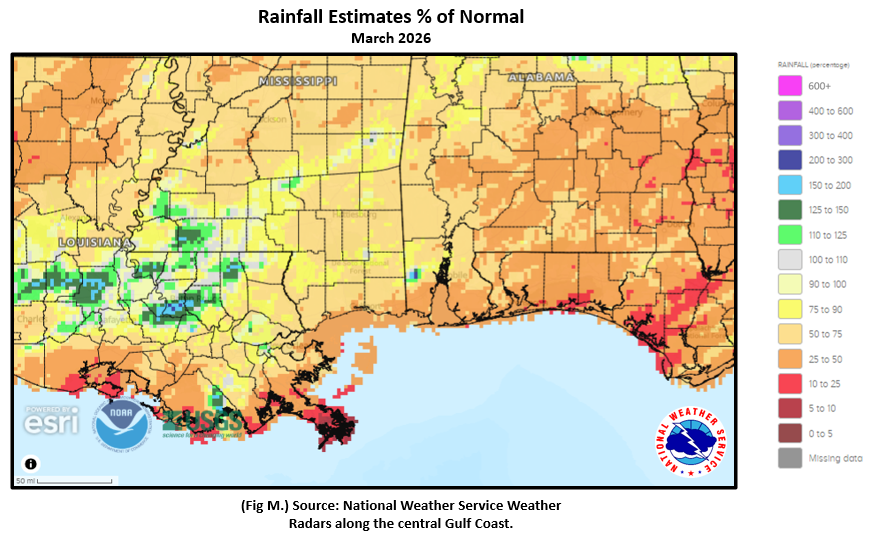 Rainfall has been in short supply with monthly departures over most of the region some 2 to 4 inches in deficit and some 25 to 75% of March normal. (Fig. K) shows the areal monthly rainfall total, (Fig. L) shows the areal rainfall departures from normal, and (Fig. M) the areal percent of normal rainfall. The lack of rainfall is exacerbating high intensity drought over the central Gulf coast. The worst of the drought, at extreme levels, is positioned over southern Georgia into northern and southern Florida. Embedded in the extreme drought is exceptional drought intensity. (Fig. N).