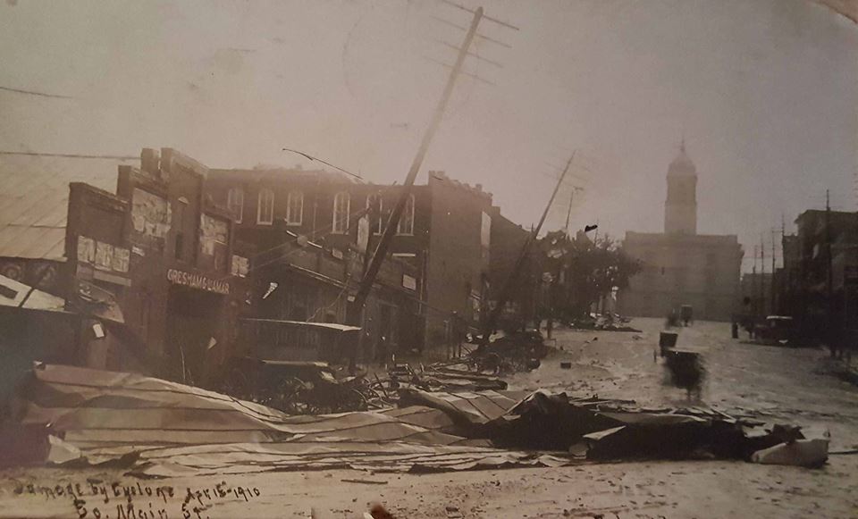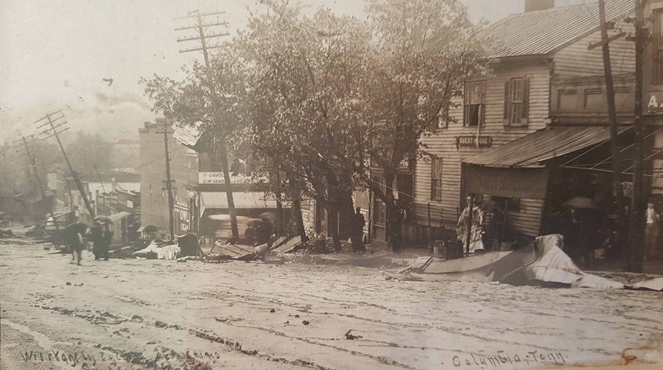An F2 tornado struck downtown Columbia, Tennessee during the early morning of April 15, 1910 (around 4:40 a.m.). The tornado was on the ground for about a mile and only one known injury resulted. Historical photographs show damage to downtown buildings on South Main Street just south of the courthouse. These images show considerable roof damage and windows blown out of several buildings with several leaning power poles.