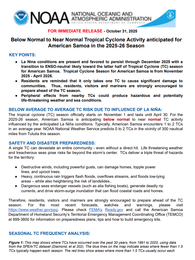 Below Normal to Near Normal Tropical Cyclone (TC) Activity anticipated for American Samoa in the 2025-26 TC Season Read More >