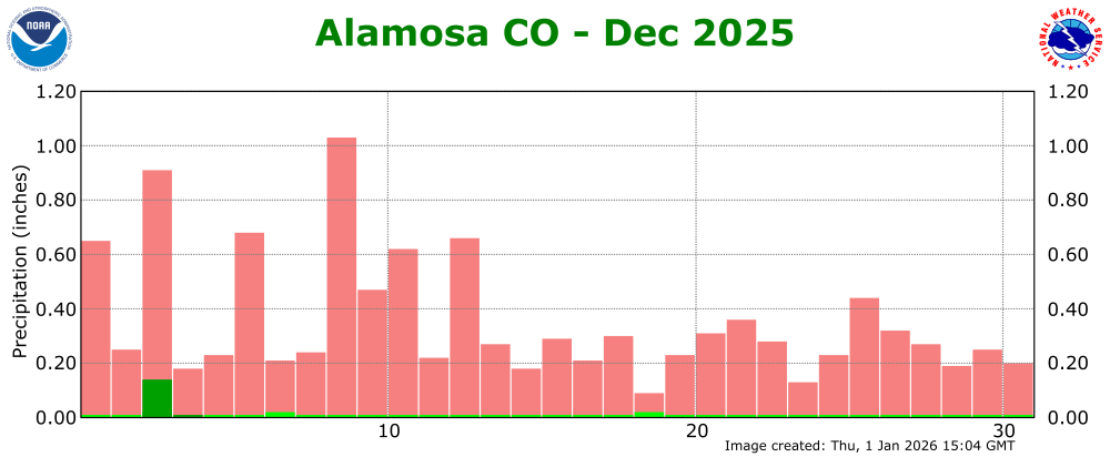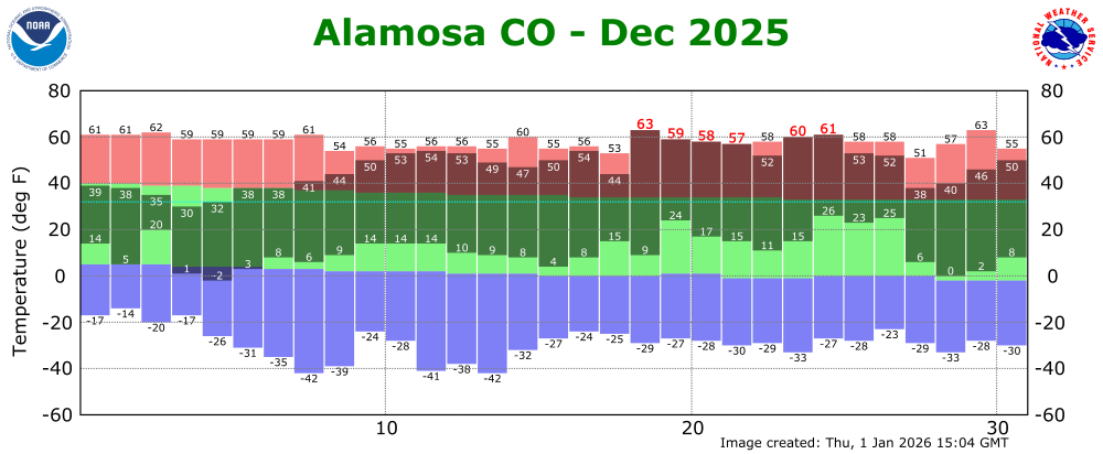The preliminary average temperature in Alamosa for the past month of December was 29.3 degrees. This is an amazing 11.2 degrees above normal and makes December of 2025 the warmest December on record In Alamosa, crushing the previous warmest December of 1980, when the average monthly temperature was 28.1 degrees. The average December maximum temperature in Alamosa was 47.7 degrees, which is 12.3 degrees above normal. The average December minimum temperature in Alamosa was 11.0 degrees, which is 10.2 degrees above normal. Alamosa recorded 0.15 inches of precipitation through the month of December. This is 0.20 inches below normal and makes December of 2025 the 35th driest December on record. Alamosa recorded 2.1 inches of snow in December, which is 2.5 inches below normal. Alamosa set six daily record high temperatures in December, including a 63F day on December 19th, which ties the record high temperature for the month of December of 63F set on December 30, 2017. (ALS POR: 1932-2025)