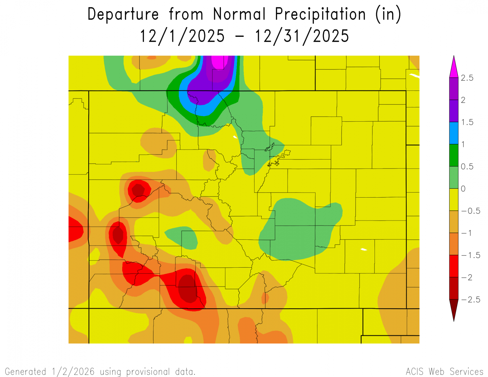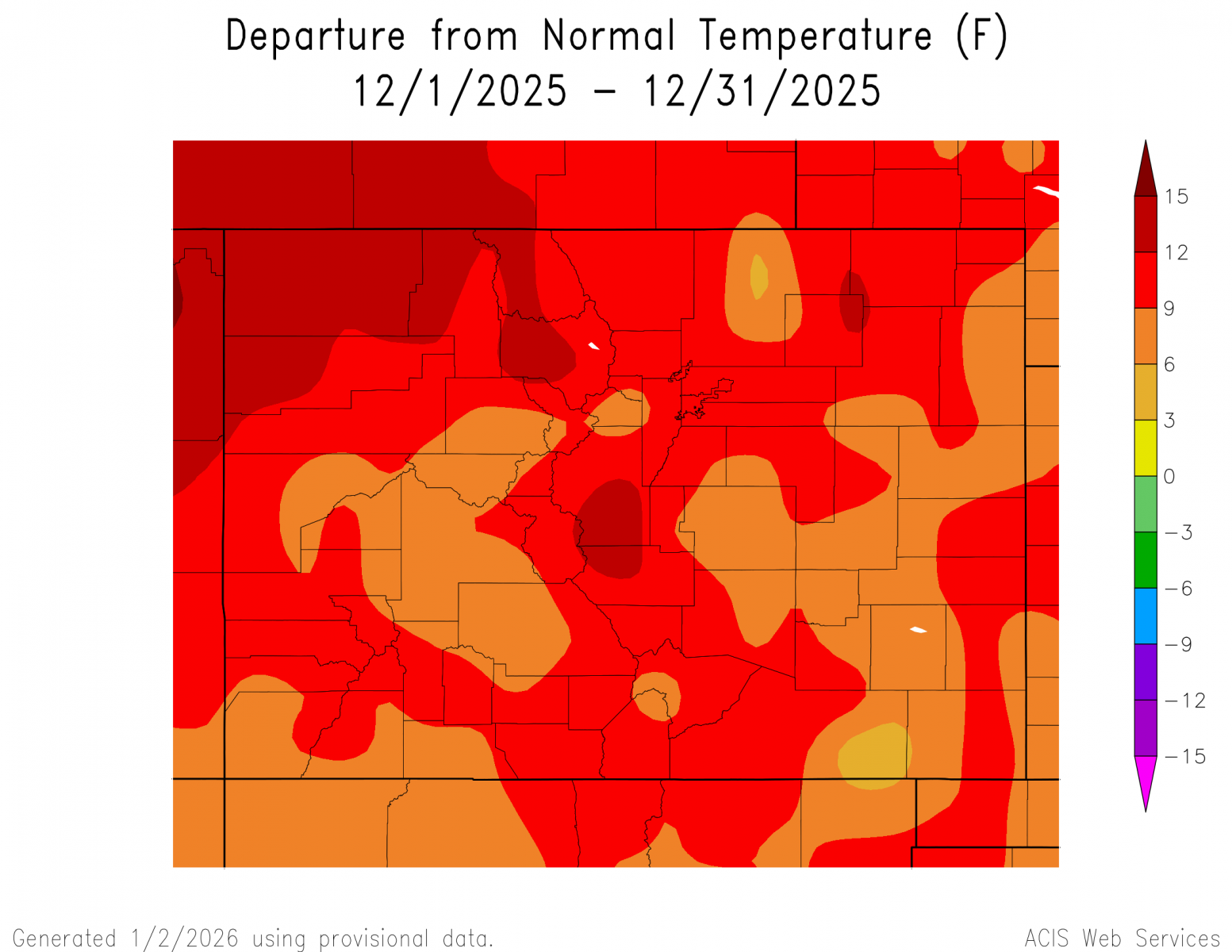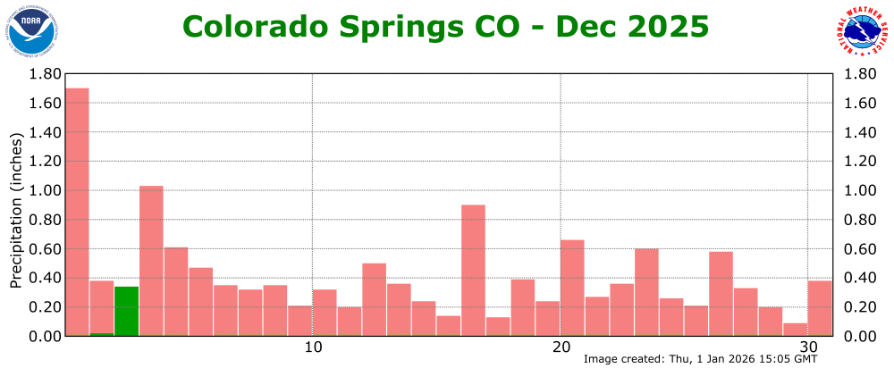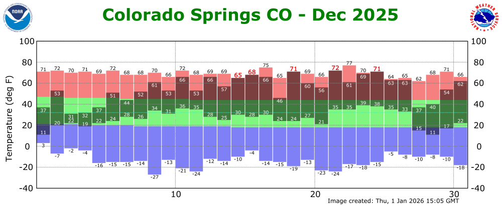 The preliminary average temperature in Colorado Springs for the past month of December was 41.0 degrees. This is an amazing 9.3 degrees above normal and makes December of 2025 tied with December of 1933 as the warmest December on record. The average December maximum temperature in Colorado Springs was 55.4 degrees, which is 10.8 degrees above normal. The average December minimum temperature in Colorado Springs was 26.6 degrees, which is 7.9 degrees above normal. Colorado Springs recorded 0.36 inches of precipitation through the month of December. This is 0.13 inches above normal and makes December of 2025 the 42nd wettest December on record. Colorado Springs recorded 4.9 inches of snow in December, which is 0.8 inches above normal. Colorado Springs set 5 daily record high temperatures through the month of December, including a new record high temperature of 71F on Christmas Day. (COS POR: 1894-2025)