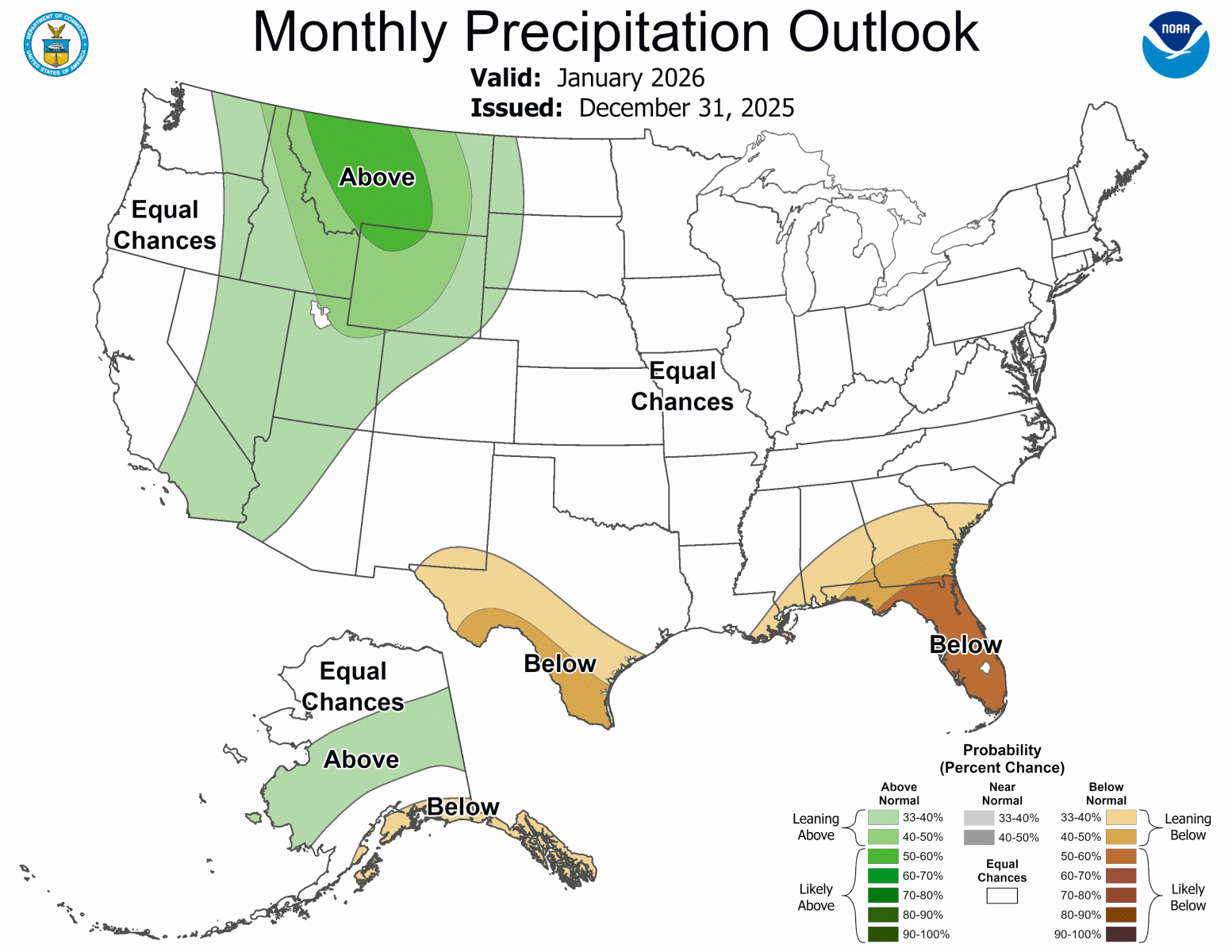 Below is the Climate Prediction Center's (CPC) temperature and precipitation outlook for January of 2026, which leans to above normal temperatures, with equal chances of above, below and near normal precipitation across south central and southeast Colorado.