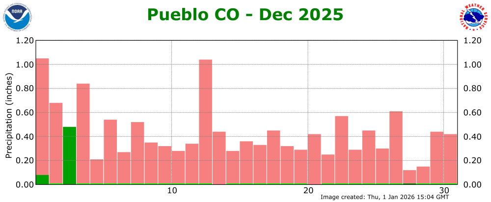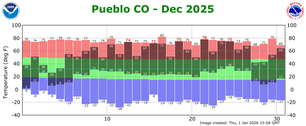 The preliminary average temperature in Pueblo for the past month of December was 39.5 degrees. This is an amazing 7.8 degrees above normal and makes December of 2025 the 4th warmest December record in Pueblo. This remains behind the warmest December of 1889, when the average December temperature was 42.2 degrees. The average December maximum temperature in Pueblo was 57.6 degrees, which is 10.1 degrees above normal. The average December minimum temperature in Pueblo was 21.3 degrees, which is 5.4 degrees above normal. Pueblo recorded 0.57 inches of precipitation through the month of December. This is 0.28 inches above normal and makes December of 2025 the 37th wettest December on record. Pueblo recorded 7.4 inches of snow in December, which is 2.8 inches above normal. Pueblo set 5 daily record high temperatures through the month of December, including a new record high temperature of 75F on Christmas Day. (PUB POR: 1888-2025)