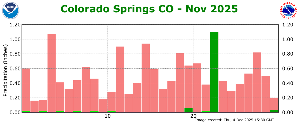 The preliminary average temperature in Colorado Springs for the past month of November was 45.9 degrees. This is 6.4 degrees above normal and makes November of 2025 tied with November of 2021 as the 2nd warmest November on record, which is just behind the warmest November of 1949, when the average monthly temperature was 47.4 degrees. The average November maximum temperature in Colorado Springs was 58.4 degrees, which is 5.5 degrees above normal. The average November minimum temperature in Colorado Springs was 33.5 degrees, which is 7.5 degrees above normal. Colorado Springs recorded 1.20 inches of precipitation through the month of November. This is 0.83 inches above normal and makes November of 2025 the 9th wettest November on record, well behind of the wettest November of 1909, when 2.30 inches of precipitation was recorded in Colorado Springs. Colorado Springs recorded 0.3 inches of snow in November, which is 4.1 inches below normal. Colorado Springs set a daily record high of 78 degrees on November 2nd, which also ties the monthly record high temperature of 78 degrees set in November of 1924, 1981, 2006, 2016, and 2020. Colorado Springs also set 2 daily record high minimum temperatures in November. Colorado Springs also set a record daily rainfall of 1.10 on November 23rd, which also sets a new record rainfall for the month of November, surpassing the 1.07 inches recorded on November 4th of 1946. Also, the 0.3 inches of snow recorded on November 30th becomes the 4th latest first measurable snowfall on record in Colorado Springs, behind December 31st, 2021, December 23rd, 1939 and December 2nd, 2016. (COS POR: 1894-2025)
