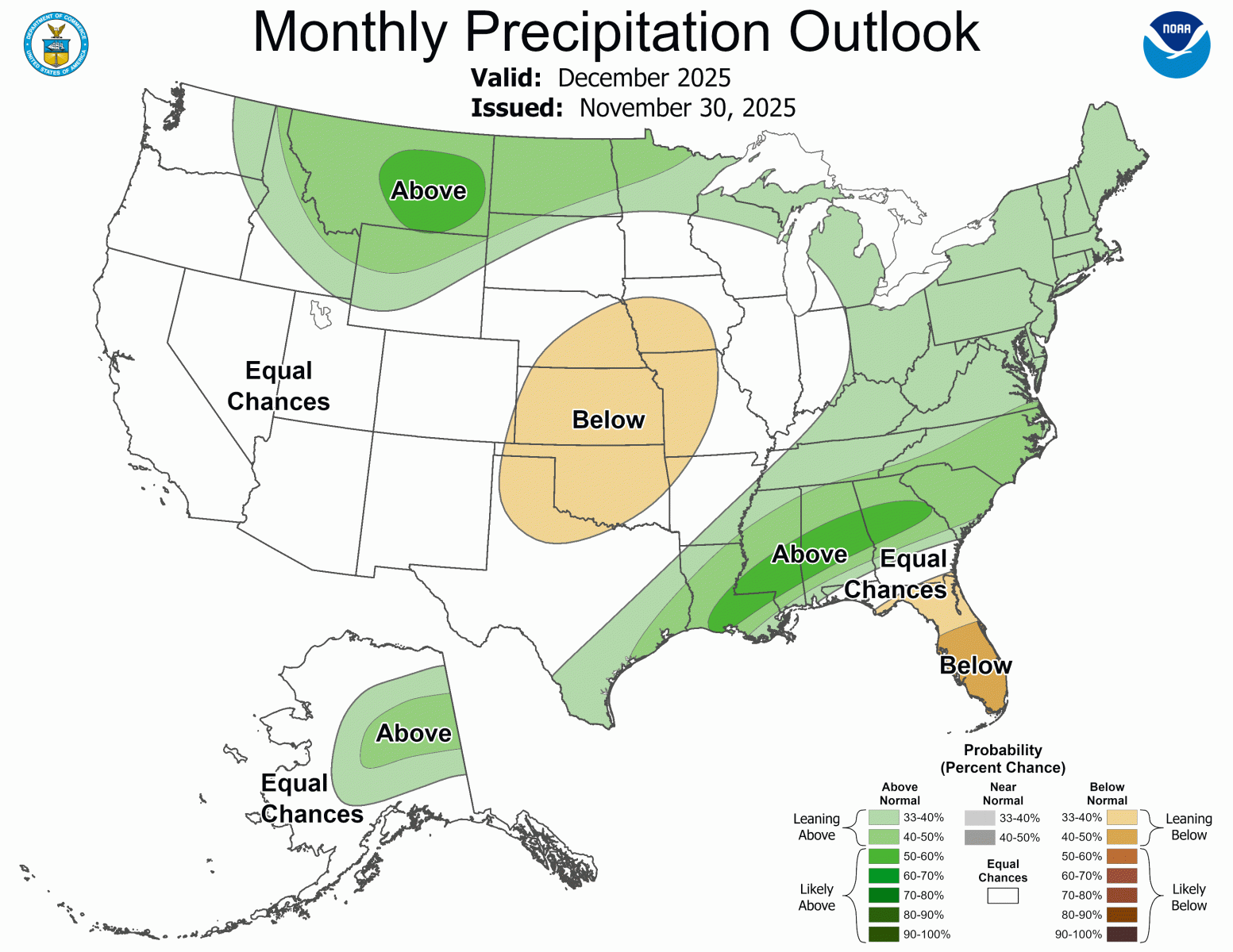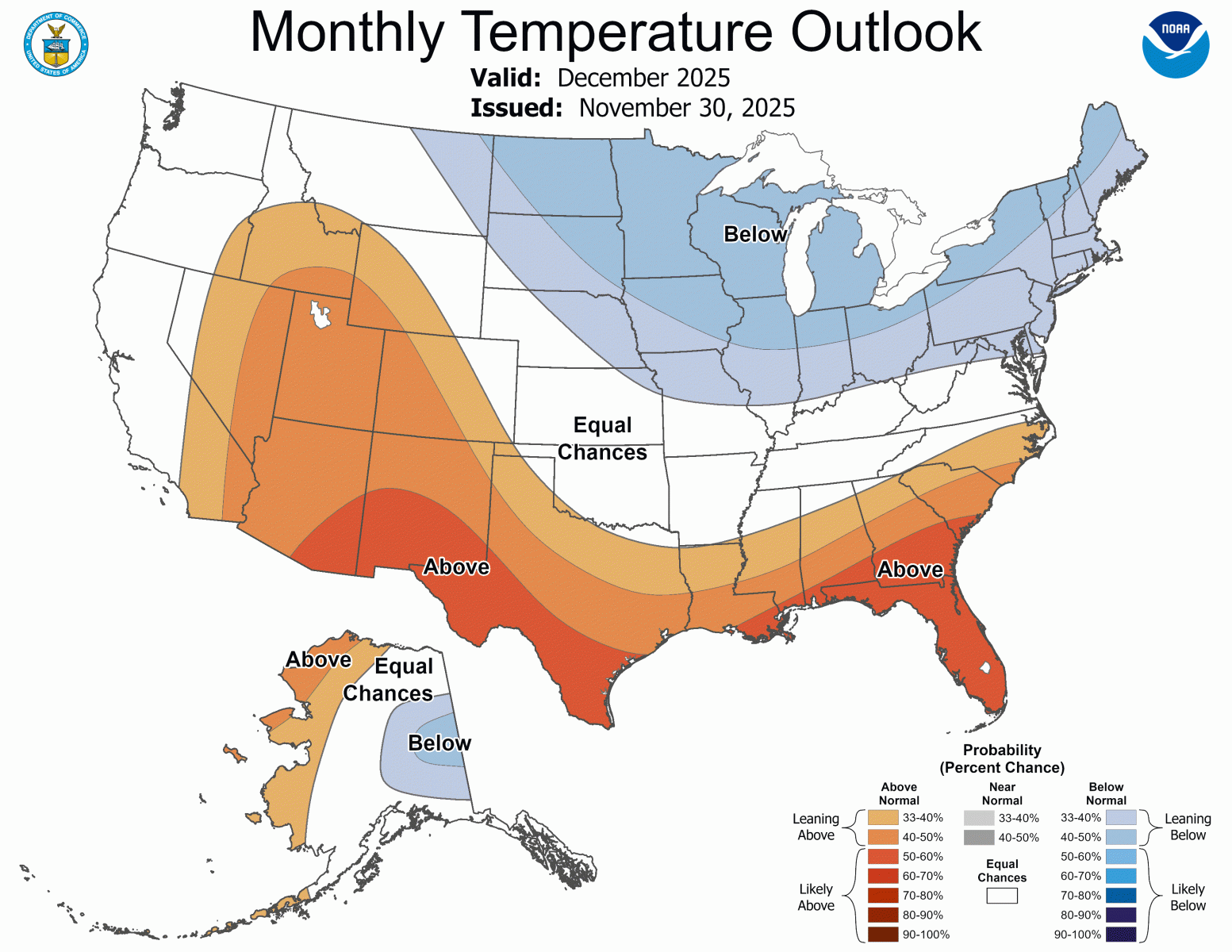 Below is the Climate Prediction Center's (CPC) temperature and precipitation outlook for December of 2025, which leans to above normal temperatures south central and southeast Colorado, along with equal chances of above, below and near normal precipitation.