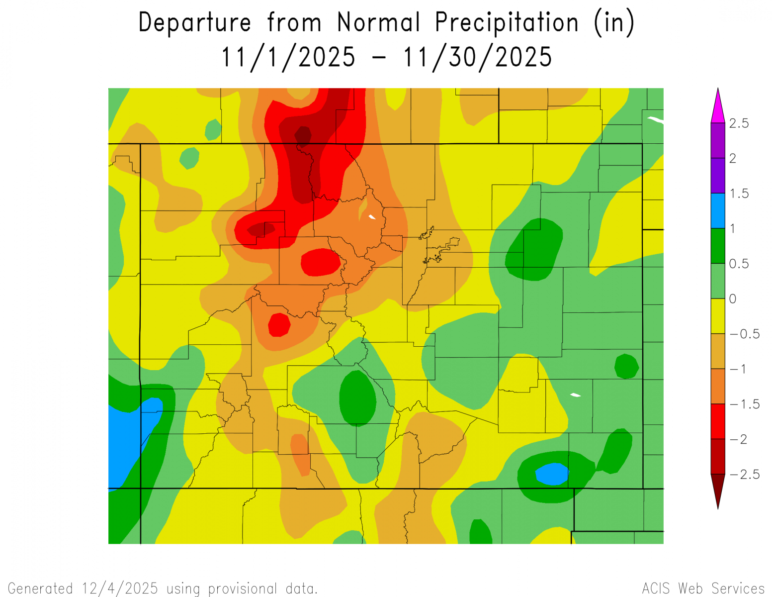 The preliminary average temperature in Alamosa for the past month of November was 36.2 degrees. This is 5.9 degrees above normal and makes November of 2025 the 2nd warmest November on record In Alamosa, just behind November of 2017, when the average monthly temperature was 38.4 degrees. The average November maximum temperature in Alamosa was 54.6 degrees, which is 6.0 degrees above normal. The average November minimum temperature in Alamosa was 17.9 degrees, which is 5.8 degrees above normal. Alamosa recorded 0.64 inches of precipitation through the month of November. This is 0.27 inches above normal and makes November of 2025 the 16th wettest November on record. This is remains below the wettest November of 2013 when 1.36 inches of precipitation was recorded in Alamosa. Alamosa recorded 0.5 inches of snow in November, which is 2.9 inches below normal. Alamosa set two daily record high temperatures and a daily record rainfall through the past month of November. (ALS POR: 1932-2025)