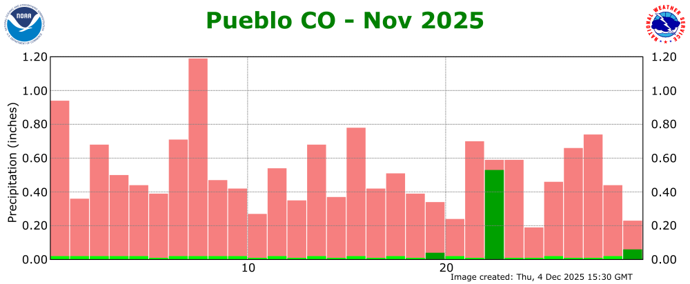 The preliminary average temperature in Pueblo for the past month of November was 45.5 degrees. This is 5.0 degrees above normal and makes November of 2025 the 8th warmest November record in Pueblo. This remains well behind the warmest November of 1949, when the average November temperature was 47.4 degrees. The average November maximum temperature in Pueblo was 61.7 degrees, which is 5.0 degrees above normal. The average November minimum temperature in Pueblo was 29.3 degrees, which is 5.1 degrees above normal. Pueblo recorded 0.63 inches of precipitation through the month of November. This is 0.16 inches above normal and makes November of 2025 the 30th wettest November on record. This remains well behind the wettest November of 2024 when 2.51 inches of precipitation was recorded in Pueblo. Pueblo recorded 0.7 inches of snow in November, which is 3.4 inches below normal. Pueblo set a new daily record high temperature of 86 degrees on November 2nd, crushing the previous record of 81F set in 2008. The 86 degrees on November 2nd also sets a new record monthly high temperature in Pueblo, surpassing the 85 degrees set on November 8th of 2006. (PUB POR: 1888-2025)