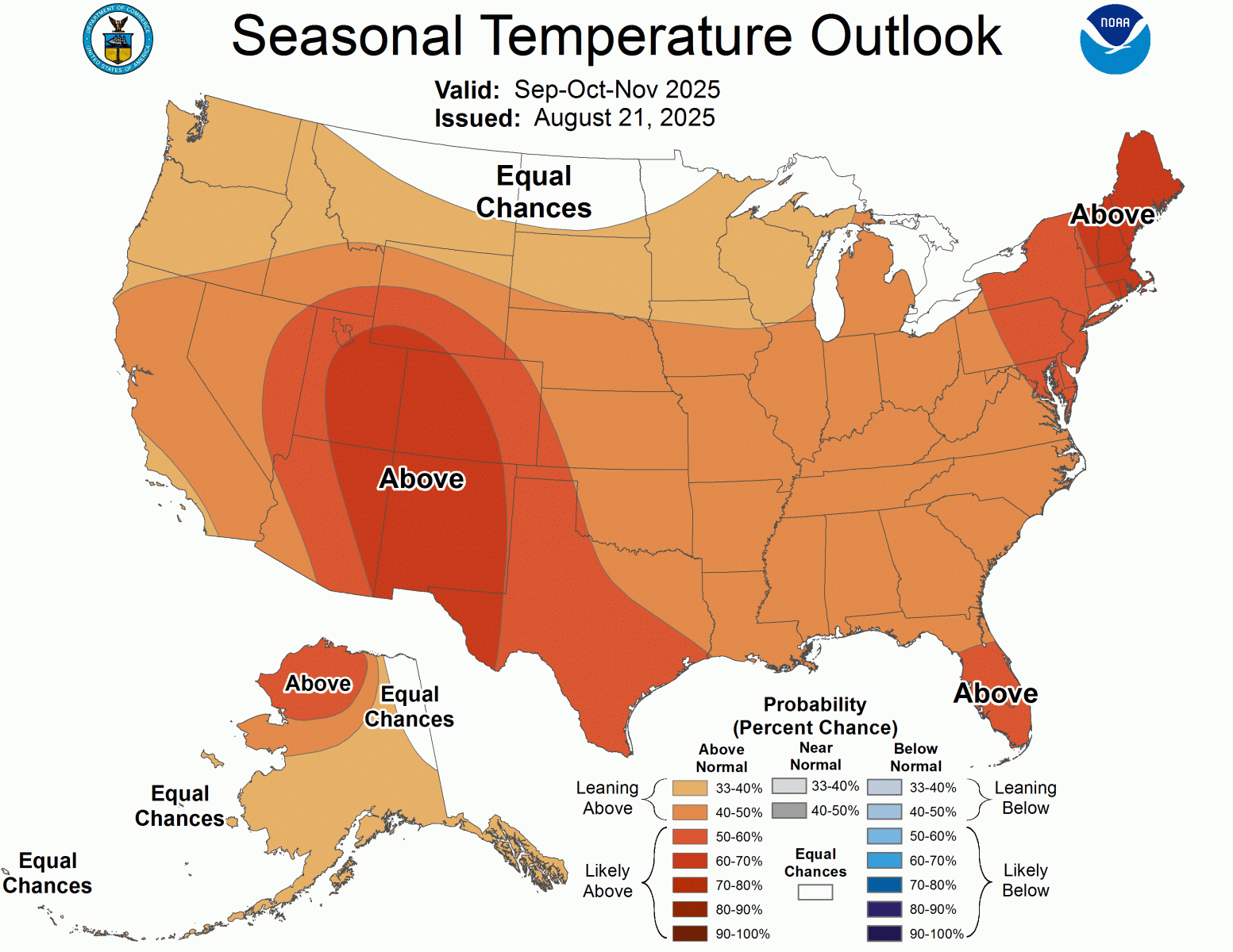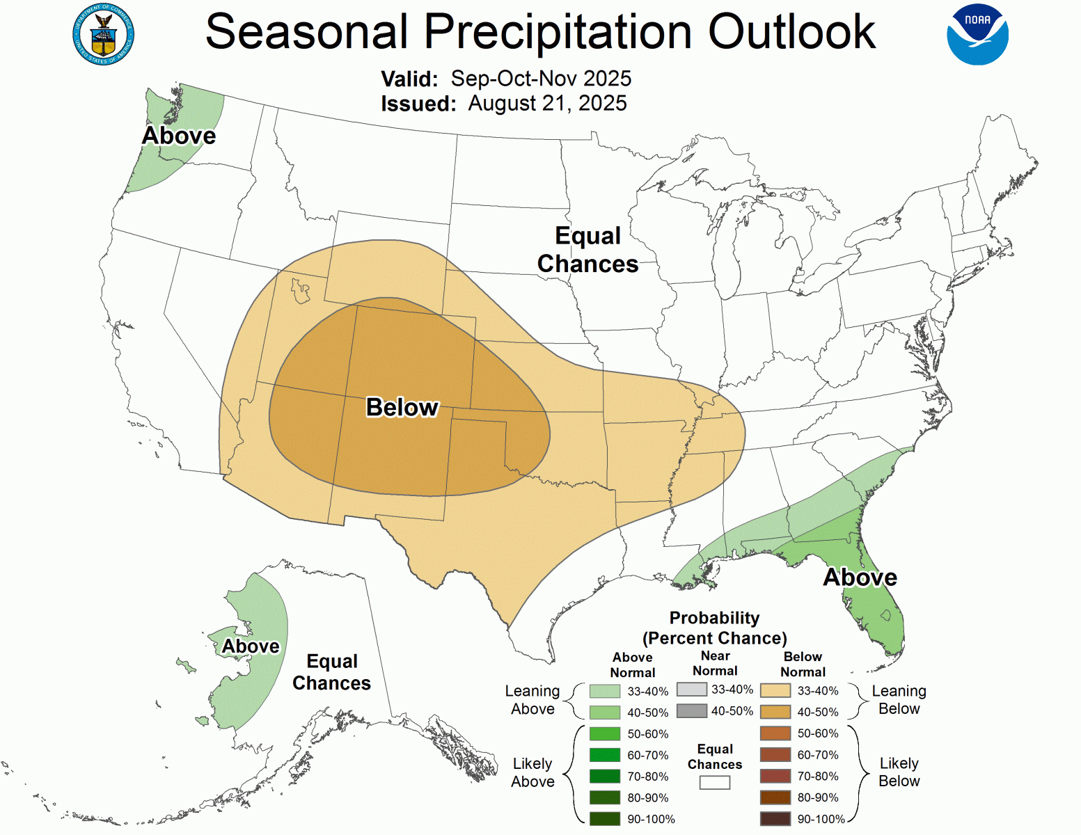 Below is the Climate Prediction Center's (CPC) temperature and precipitation outlook for the Fall of 2025 (September, October and November) which leans to above normal temperatures and below normal precipitation across south central and southeast Colorado.