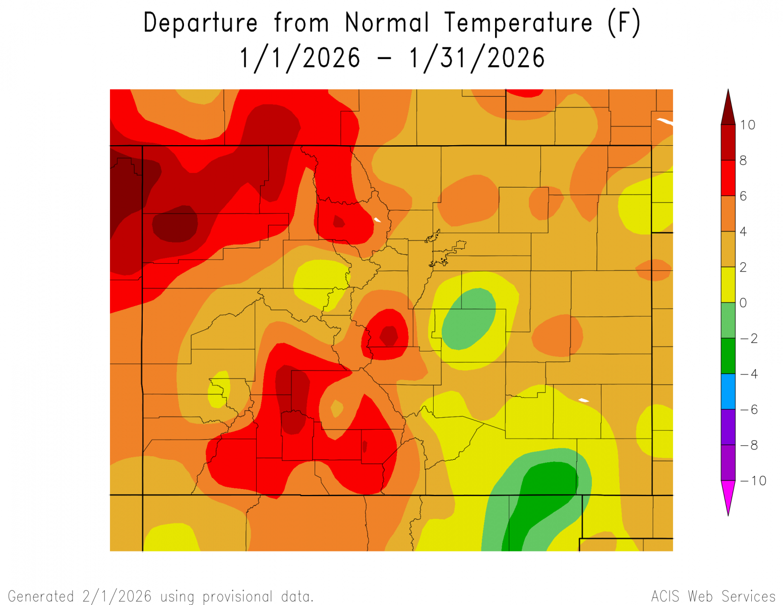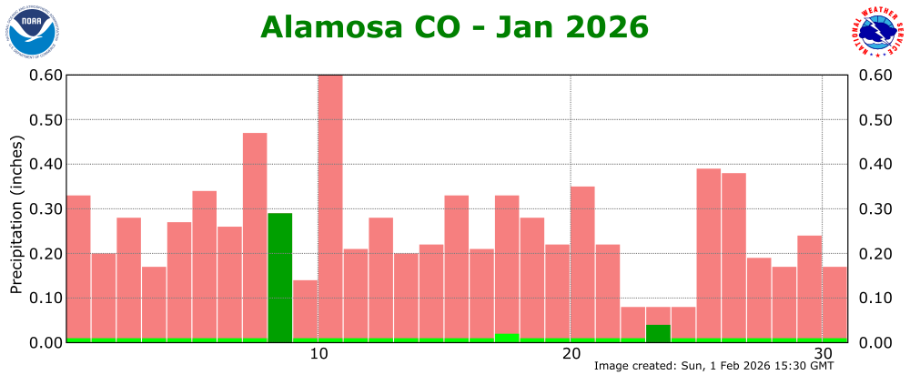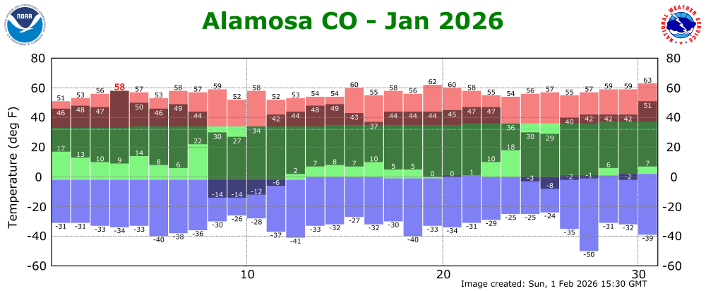The preliminary average temperature in Alamosa for the past month of January was 23.4 degrees. This is 6.6 degrees above normal and makes January of 2026 the 11th warmest January on record In Alamosa. This is remains behind the warmest January of 2003, when the average January temperature was 26.4 degrees. The average January maximum temperature in Alamosa was 42.7 degrees, which is 7.9 degrees above normal. The average January minimum temperature in Alamosa was 4.0 degrees, which is 5.1 degrees above normal. Alamosa recorded 0.33 inches of precipitation through the month of January. This is 0.01 inches above normal and makes January of 2026 tied as the 26th wettest January on record. Alamosa recorded 7.0 inches of snow in January. This is 2.5 inches above normal and makes January of 2026 tied as the 18th snowiest on record. Alamosa set one daily record high temperature, one daily record precipitation and 2 daily record snowfalls through out the month of January. (ALS POR: 1932-2026)