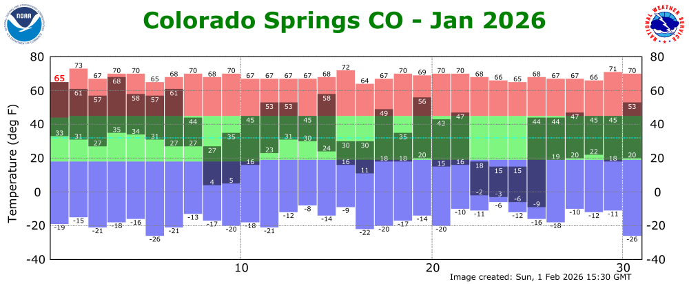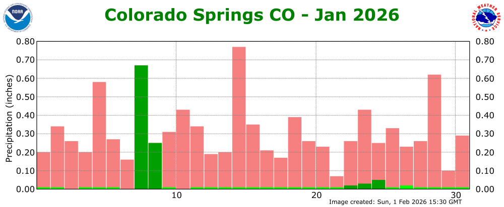 The preliminary average temperature in Colorado Springs for the past month of January was 31.8 degrees, which is 0.1F above normal. The average January maximum temperature in Colorado Springs was 45.3 degrees, which is 0.3 degrees above normal. The average January minimum temperature in Colorado Springs was 18.4 degrees, which is 0.1 degrees below normal. Colorado Springs recorded 1.02 inches of precipitation and 16.2 inches of snow through the month of January. This is 0.73 inches and 11.3 inches above normal, respectively, making January of 2026 the 3rd wettest and 2nd snowiest January on record, behind the wettest and snowiest January of 1987 when 1.17 inches of precipitation and 28.7 inches of snow was recorded in Colorado Springs. Colorado Springs set one daily record high temperature and two daily record precipitation and snowfalls through the month of January. (COS POR: 1894-2026)