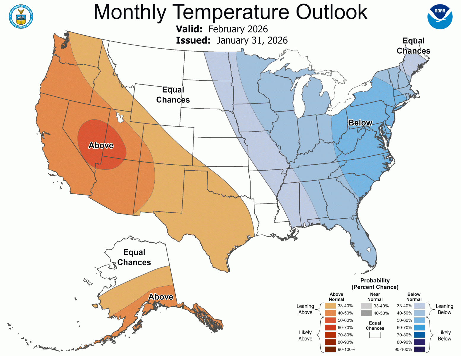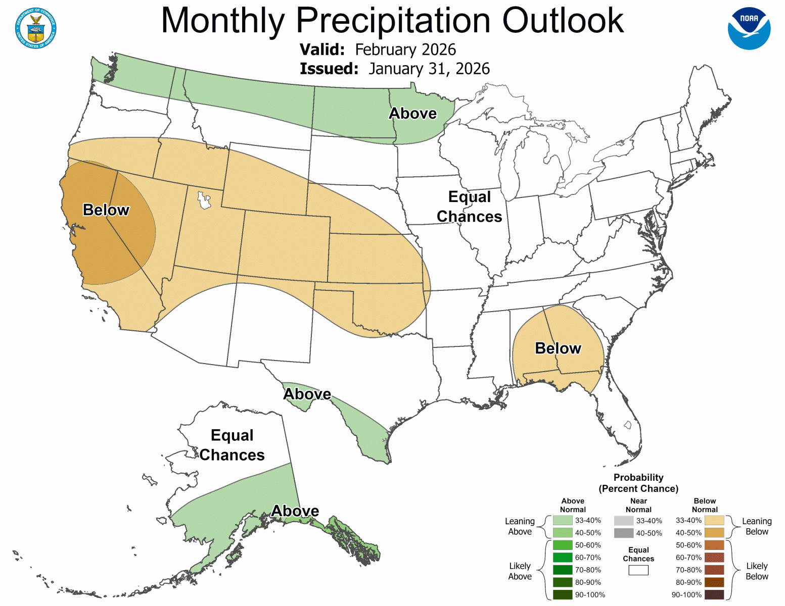 Below is the Climate Prediction Center's (CPC) temperature and precipitation outlook for February of 2026, which leans to above normal temperatures and below normal precipitation across south central and southeast Colorado.