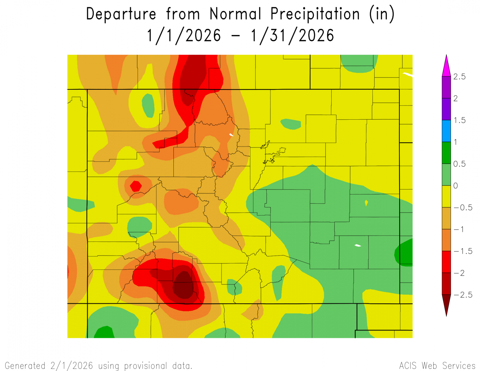 Upper level ridging remained in place across the region through much of the month of January, bringing periods of very warm and dry conditions to south central and southeast Colorado. A few passing weather systems also brought precipitation and colder temperatures to the region, especially across Eastern Colorado, which saw an Arctic airmass move across the plains towards the end of the month. For the month as a whole, above normal temperatures and below normal precipitation were experienced across south central and southeast Colorado, save for pockets of below normal temperatures and above normal precipitation across the southeast pains.
