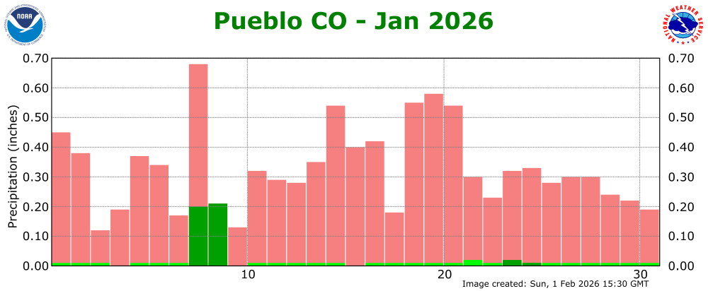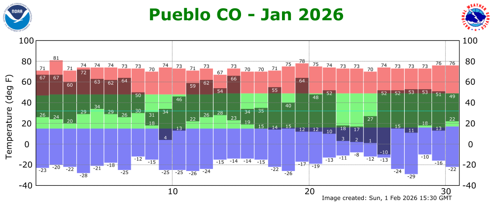 The preliminary average temperature in Pueblo for the past month of January was 33.6 degrees. This is 1.7 degrees above normal and makes January of 2026 tied as the 37th warmest January record in Pueblo. This remains behind the warmest January of 1953, when the average monthly temperature was 40.1 degrees. The average January maximum temperature in Pueblo was 50.2 degrees, which is 1.8 degrees above normal. The average January minimum temperature in Pueblo was 16.9 degrees, which is 1.5 degrees above normal. Pueblo recorded 0.44 inches of precipitation and 5.5 inches of snow through the month of January. This is 0.15 inches and 0.6 inches above normal, respectively, making January of 2026 the 37th wettest and 48th snowiest January on record. Pueblo set a daily precipitation and snowfall through the month of January. (PUB POR: 1888-2026)