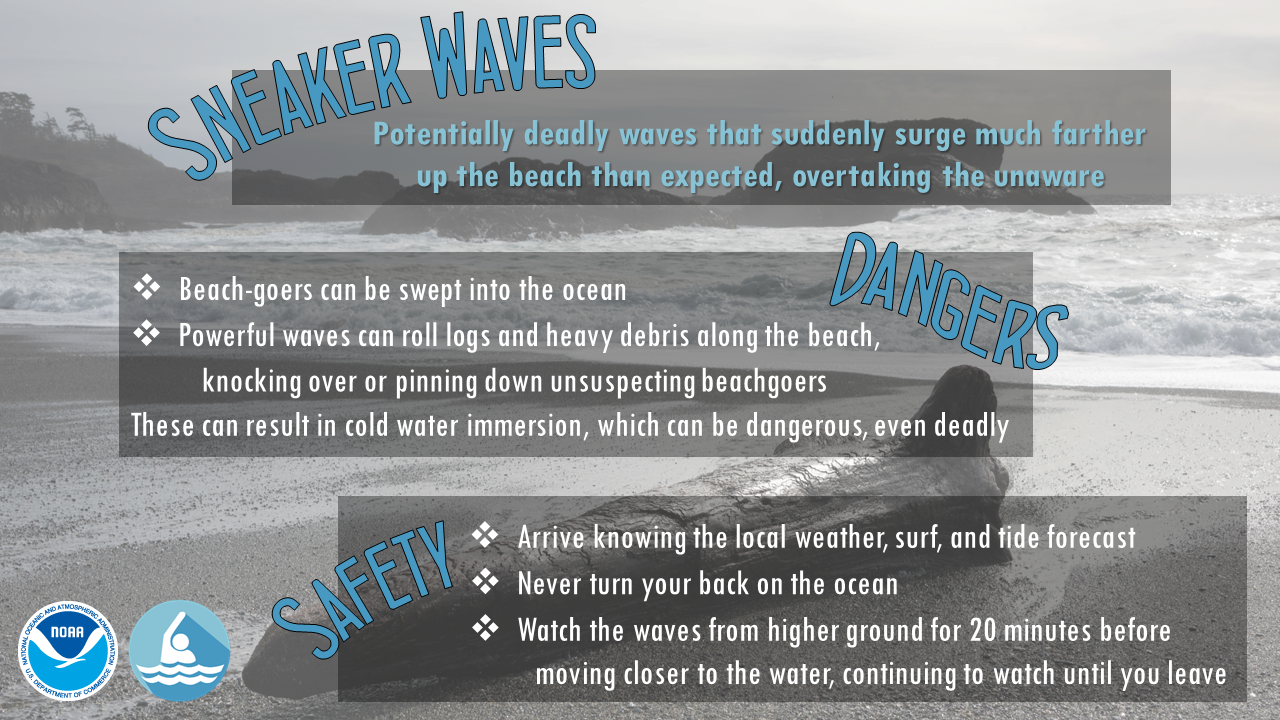 A trip to the beach should be fun. Unfortunately, many people are injured or killed along our nation's beaches by hazards sneaker waves and log rolls. The National Weather Service can help ensure you leave the beach with good memories. NWS provide you the information you need to stay safe on beaches and in coastal areas and surf zones. A surf zone is defined as the area of water between the beach/shore and the first line of breaking waves. See our photos of dangerous waves.